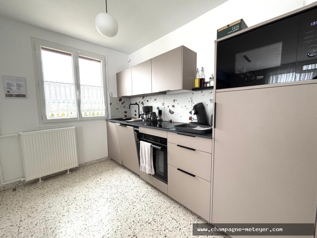 - Entrée sur le séjour ouvert sur la cuisine équipée ; Salon avec canapés. Trois chambres aménagées. Salle-de-bain, WC.